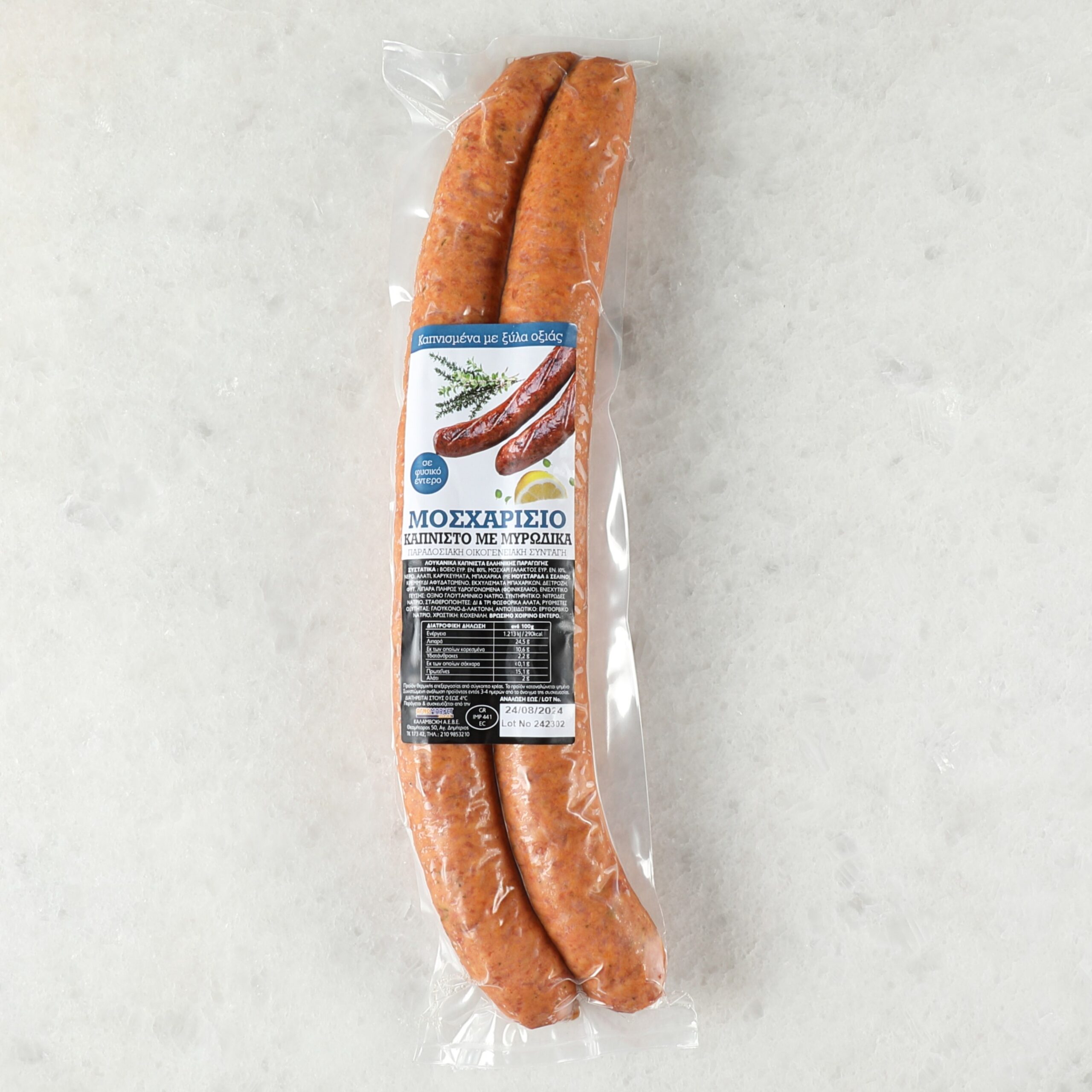 Συστατικά: Προϊόν θερμικής επεξεργασίας από βόειο κρέας ΕΥΡ.ΕΝ.(80 %), μοσχάρι γάλακτος ΕΥΡ.ΕΝ. (10%), νερό, αλάτι, καρυκεύματά, μπαχαρικά (ΣΙΝΑΠΙ & ΣΕΛΊΝΟ), κρεμμύδι αφυδ/νο, εκχ. μπαχαρικών, δεξτρόζη, φυτικά λιπαρά πλήρως υδρογονομένα (φοινικέλαιο), ενισχυτικό γεύσης: όξινο γλουταμινικό νάτριο, σταθεροποιητές: Δι&Τρι φωσφορικά άλατα, συντηρητικό: νιτρώδες νάτριο, αντιοξειδωτικό ερυθορβικό νάτριο, ρυθμιστής οξύτητας, γλυκογόνο-Δ- λακτόνη, χρωτική: κοχενίλη, βρώσιμο χοιρινό έντερο αλατισμένο
