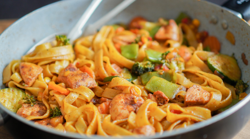 Μόλις το κοτόπουλο και οι χυλοπίτες είναι έτοιμα, τα ενώνουμε ανακατεύοντας καλά μέχρι να ομογενοποιηθούν.
