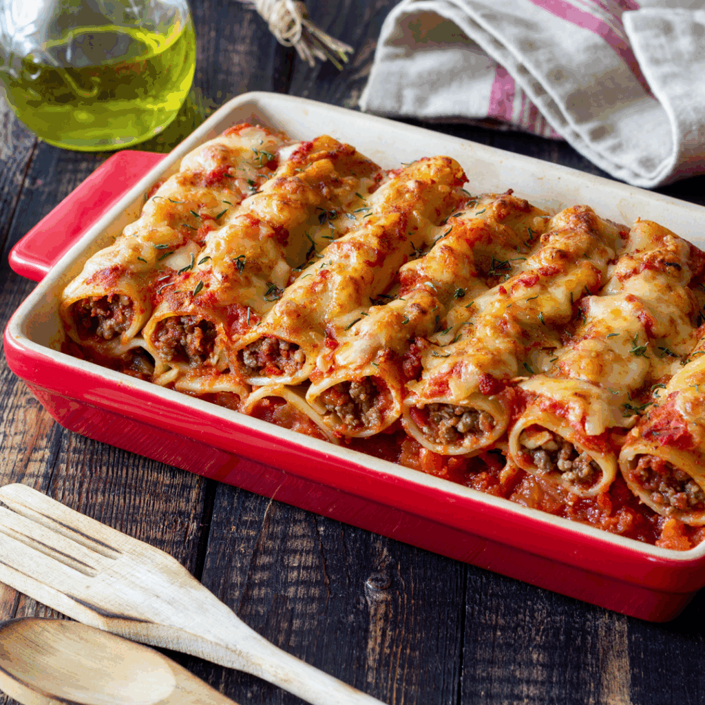 Κανελόνια με κιμά: ζουμερός μοσχαρίσιος κιμάς σε τραγανό ζυμαρικό με αρωματική σάλτσα ντομάτας και λιωμένο τυρί.
