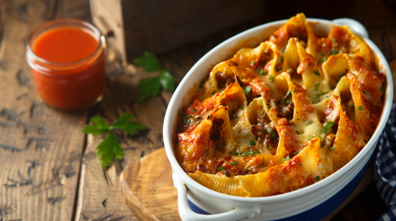 Λαχταριστά κοχύλια γεμιστά με κιμά και τυριά, ψημένα σε πλούσια σάλτσα ντομάτας. Ιδανικό πιάτο για ξεχωριστά οικογενειακά γεύματα.