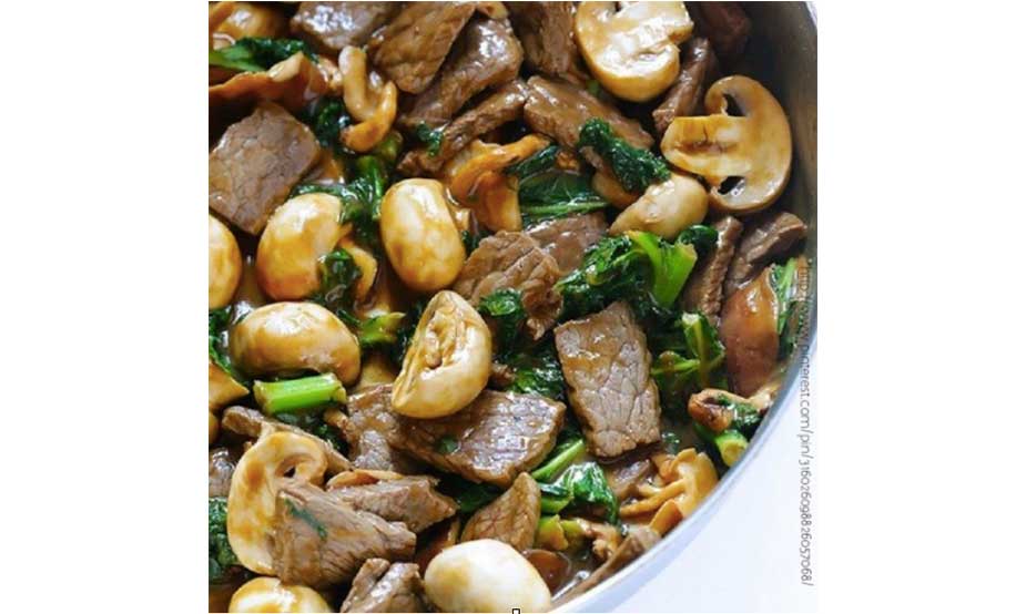 Κόβουμε το κρέας σε μέτριους κύβους και το σωτάρουμε στο ελαιόλαδο. Ρίχνουμε τα τριμμένα κρεμμύδια μέχρι να ροδίσουν και σβήνουμε με ένα ποτηράκι λευκό κρασί. Προσθέτουμε το νερό και βράζουμε για 1 ώρα. Στη συνέχεια ρίχνουμε τα μανιτάρια, τη σελινόριζα, το σπανάκι και τα μυρωδικά, αλατοπιπερώνουμε και συνεχίζουμε το βράσιμο για 1 ώρα περίπου ακόμα μέχρι να ομογενοποιηθεί το μίγμα σε γίνει μια ωραία σάλτσα.
